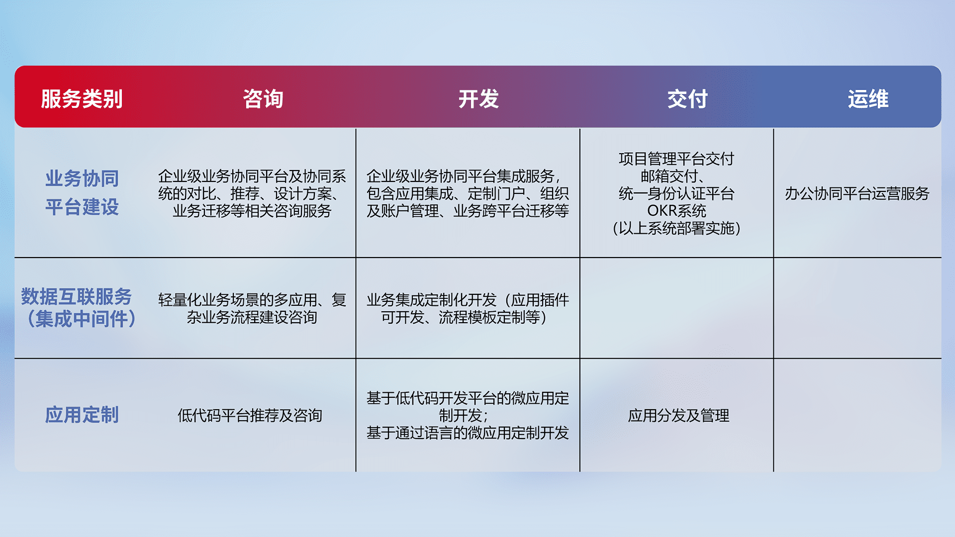 针对钉钉、、、企微、、IDaas等平台级产品提供产品的规划、、、、方案、、、交付、、、、定制化开发等服务,,,实现如统一协同办公、、智能客户服务、、、、混合会议管理、、、智能数据查询、、等业务场景,,,实现数字化转型。。