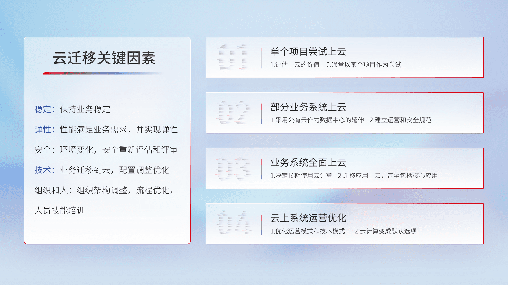 结合实际业务,,,,从规划设计、、云平台选型、、、云原生改造、、、数据迁移、、、、集成交付,,迁移全过程为客户识别最佳上云路径,,做好风险识别管理,,设计网络架构、、、、身份权限、、、安全审计合规、、、、操作审计、、、日志审计、、、监控告警策略、、、多站点容灾设计等,,对云上基础设施进行整体规划,,,,提升IT治理水平,,,,以满足弹性、、、高可用、、、、高性能的需求。。。。
