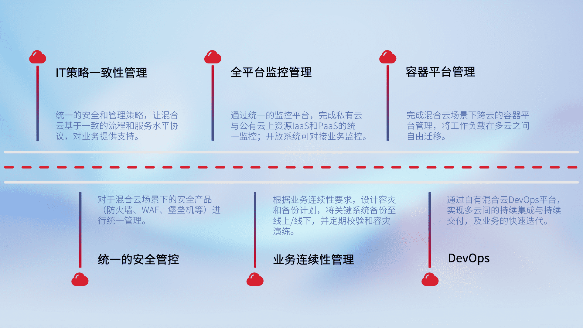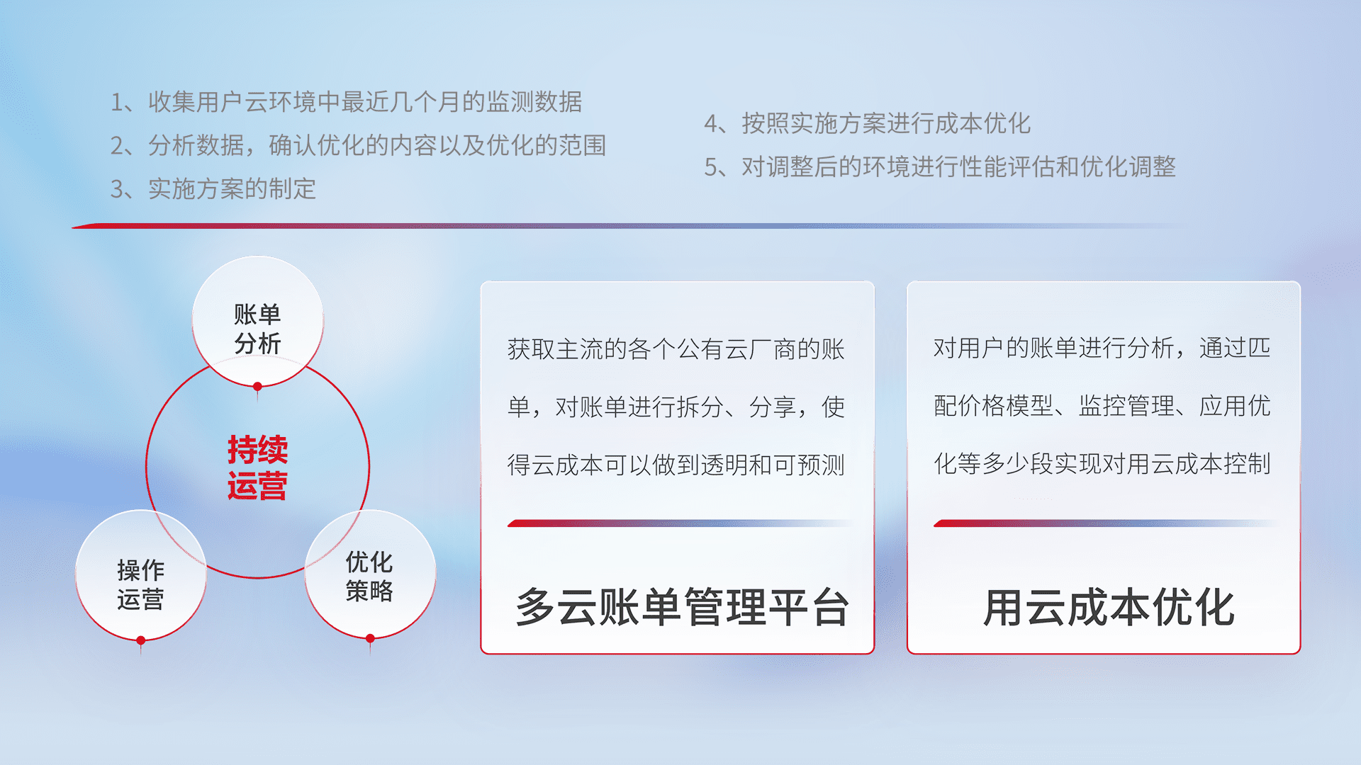 通过多云纳管,,,,以统一的资源数据模型把客户的云资源进行抽象和封装,,,,进而实现对多云资源的统一操作,,保障云资源管理的可靠性、、、稳定性与可用性。。量身定制化运维内容,,,配置、、、、开发运维、、、、补丁管理、、备份、、监控、、、、认证和访问管理、、审计和日常巡检等,,,,保障在用云过程中的可靠度,,,,稳定度以及高可用率。。。
