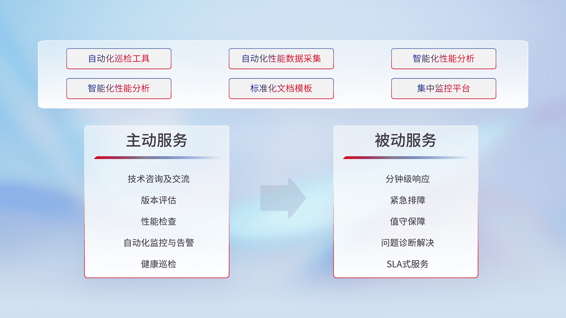 智能化工具和标准化文档,,,保障服务质量,,,提供主动服务(包含技术咨询、、版本评估、、、、性能检查、、、自动化监控与告警、、健康巡检)和被动服务包含(分钟级响应、、、、紧急排障、、、值守保障、、问题诊断解决、、SLA服务)。。。。